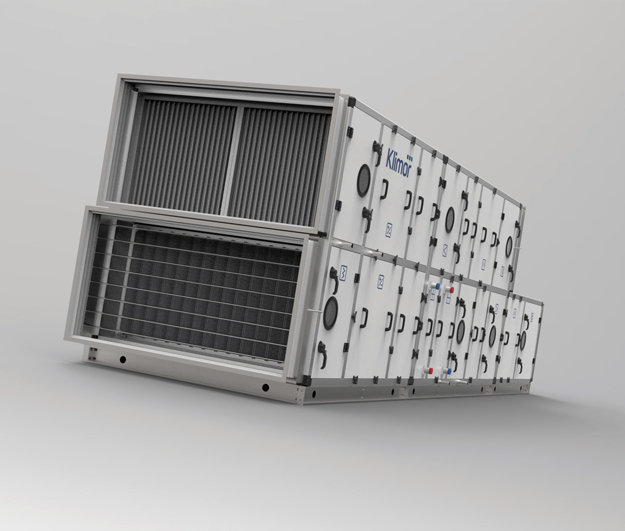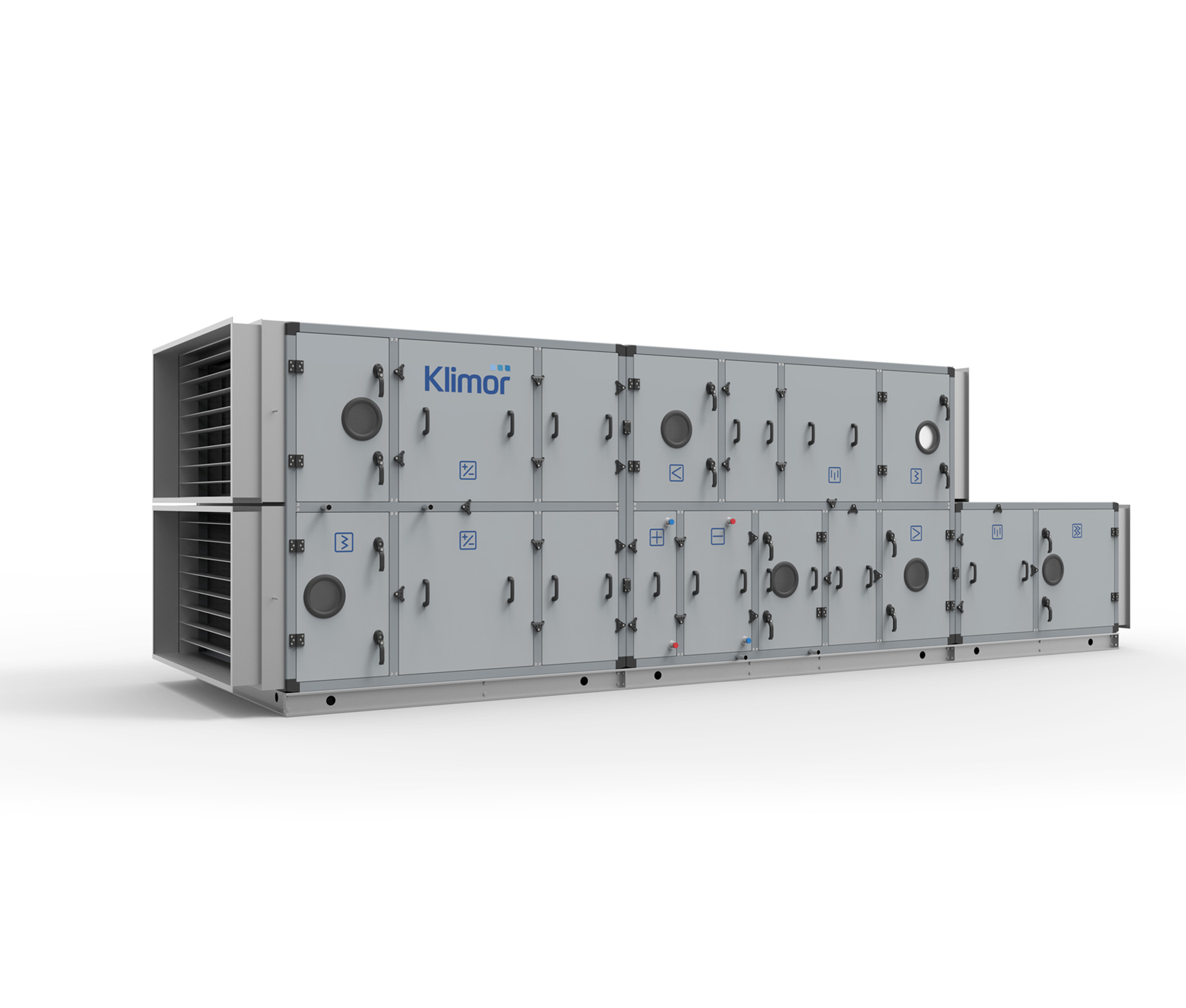Klimor EVO-H — modulārās ventilācijas iekārtas higiēniskā izpildījumā tīrām zonām, ārstniecības iestādēm un pārtikas rūpniecībai. Korpuss ar termopārtraukuma paneļiem 50 mm (A1), nerūsējošā tērauda kondensāta paliktni ar trīskāršu slīpumu, hermētisku filtru uzstādījumu (līdz F9/HEPA atbilstoši projektam), pretkorozijas pārklājumu, apskates iluminatoriem un apgaismojumu. Pieejama enerģijas atgūšana ar atdalītu kontūru ar 100% plūsmu atdalīšanu un lietderības koeficientu līdz ~76%, BMS integrācija. Sertifikācija: EN 1886, EN 13053, Eurovent, CE, ETL.